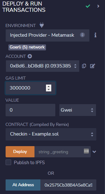 注意environment选择Metamask,账户就会同步你的Metamask账户。然后输入题目部署好的合约地址,并点击At Address。然后在下方可以对合约的函数进行调用。