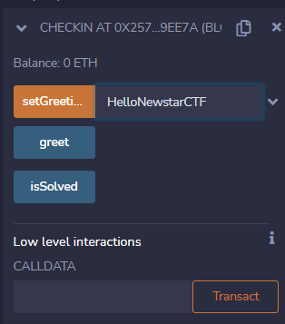 内容很简单,我们只需要把合约中的greeting变量通过set函数更改为”HelloNewstarCTF”即可。