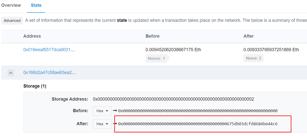 利用题目描述给出的地址去etherscan查看。点进该合约的第一条交易,进入State选项卡下。